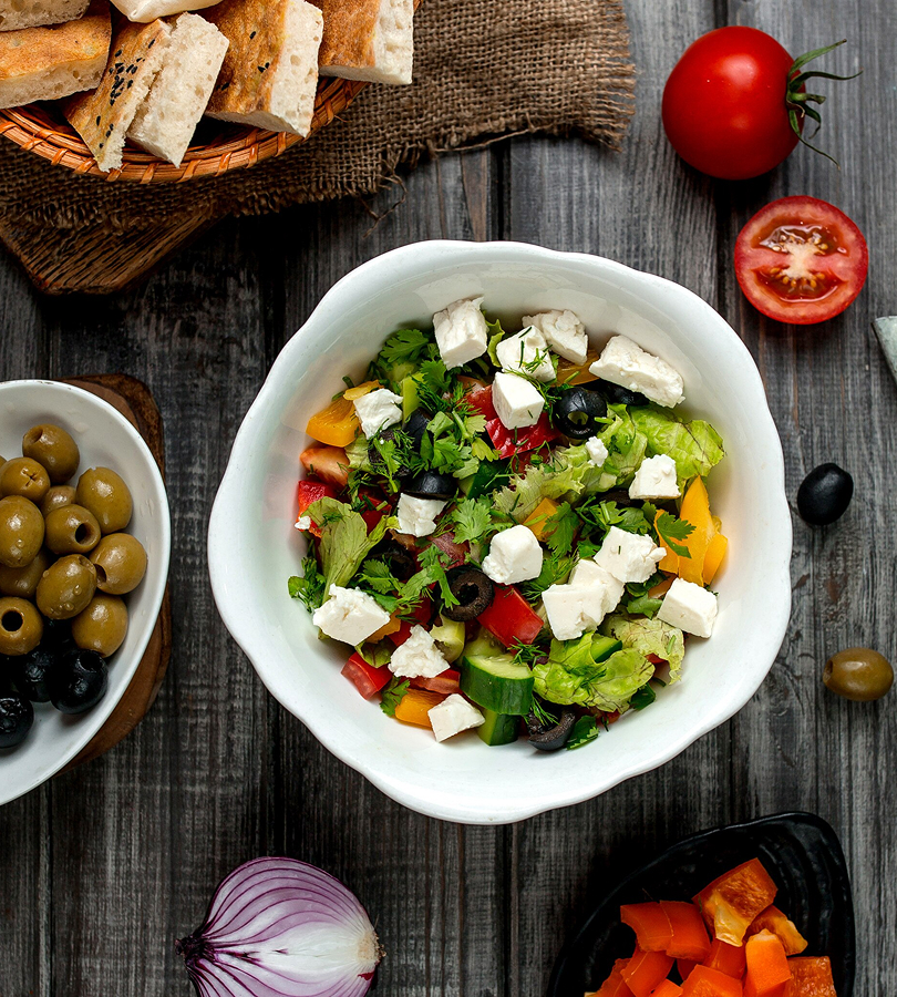 Queso feta, aceitunas negras, pepino, tomate, cebolla roja y aderezo balsámico.