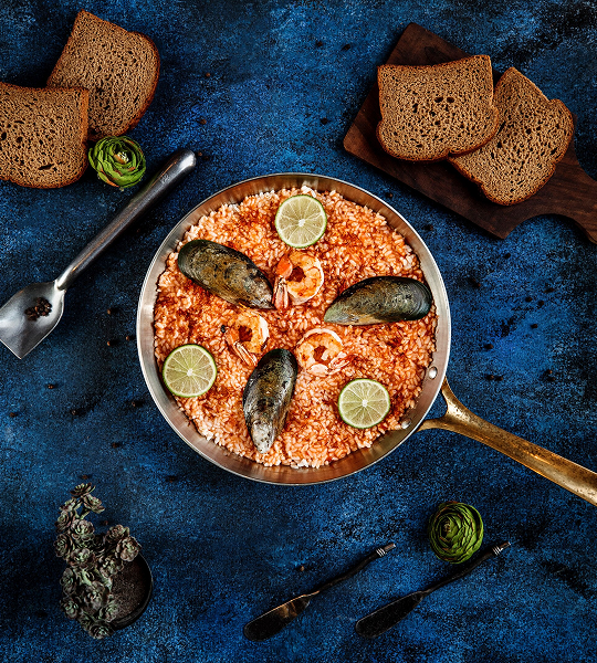 Tradicional paella murciana con mariscos frescos, arroz, azafrán y verduras locales de calidad.
